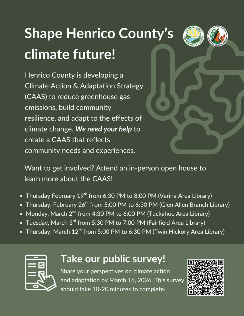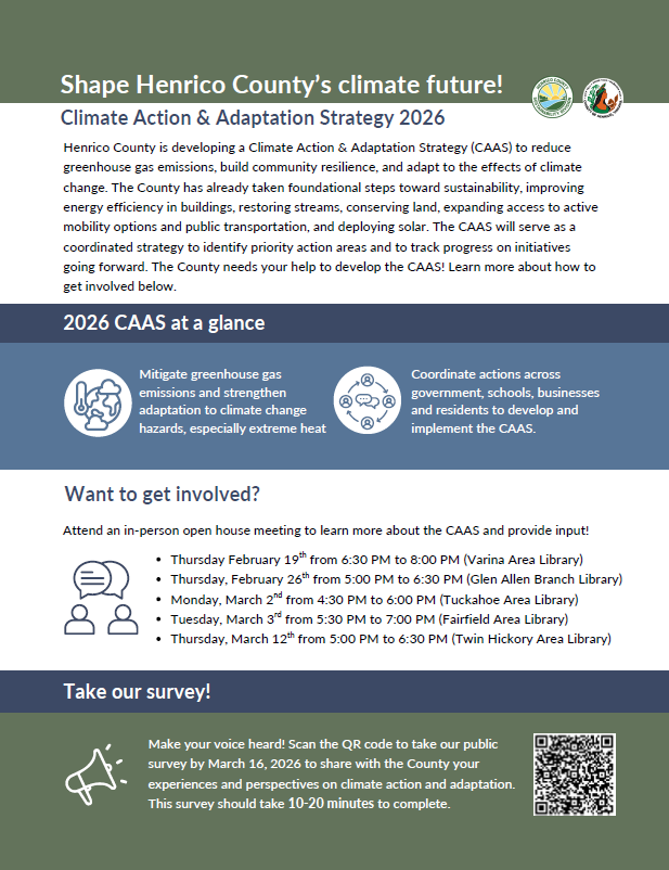 The County needs your help to develop the CAAS! Get involved by taking our survey to share your experiences and perspectives on local climate action and adaptation efforts in Henrico by March 16. This survey should take you 10-20 minutes to complete. https://forms.office.com/r/CEHd4CLedT