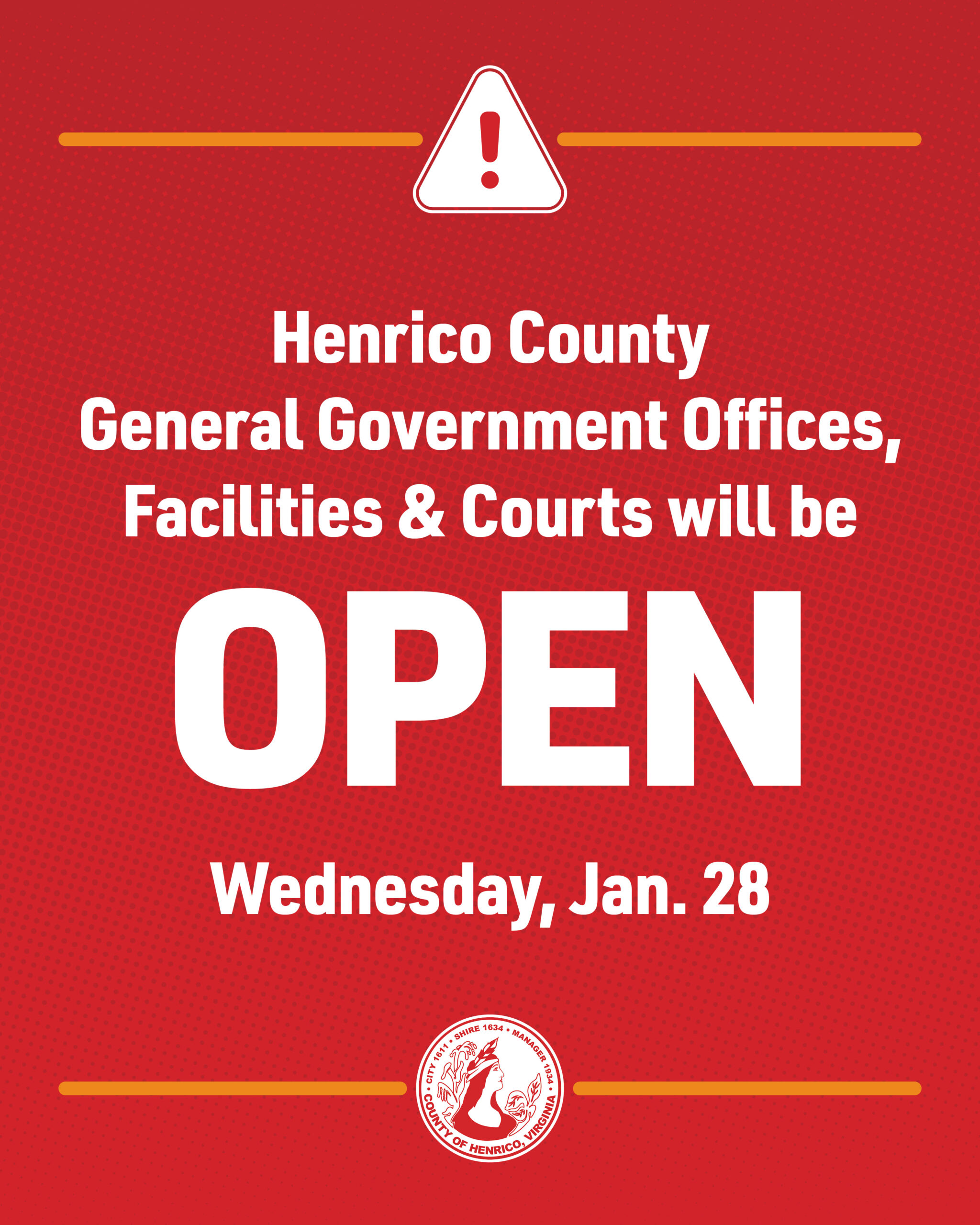 Henrico County general government offices and facilities and Henrico courts and clerks’ offices will operate on a normal schedule Wednesday, Jan. 28.