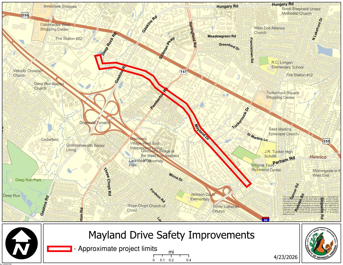The County of Henrico will be constructing accommodations to improve safety, accessibility, mobility, and connectivity along Mayland Drive between Parham Road and Deep Rock Road. The following improvements will be constructed, including: Restripe existing 4-lane undivided roadway to provide for a single travel lane in each direction and a center turn lane along with buffered bike lanes. This is also known as roadway reconfiguration. |