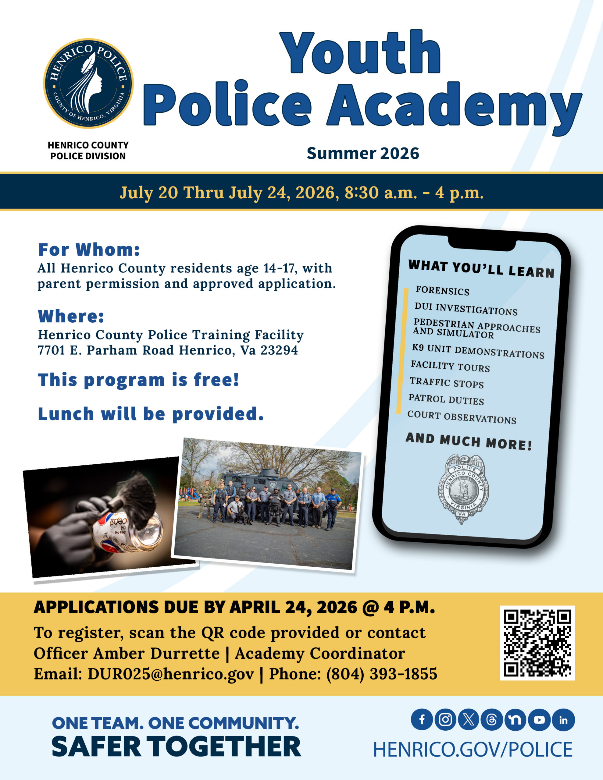 To participate in the 2025 Henrico Youth Police Academy, applicants must complete and submit an application package by the Friday, April 24, deadline. Applications should be returned to: